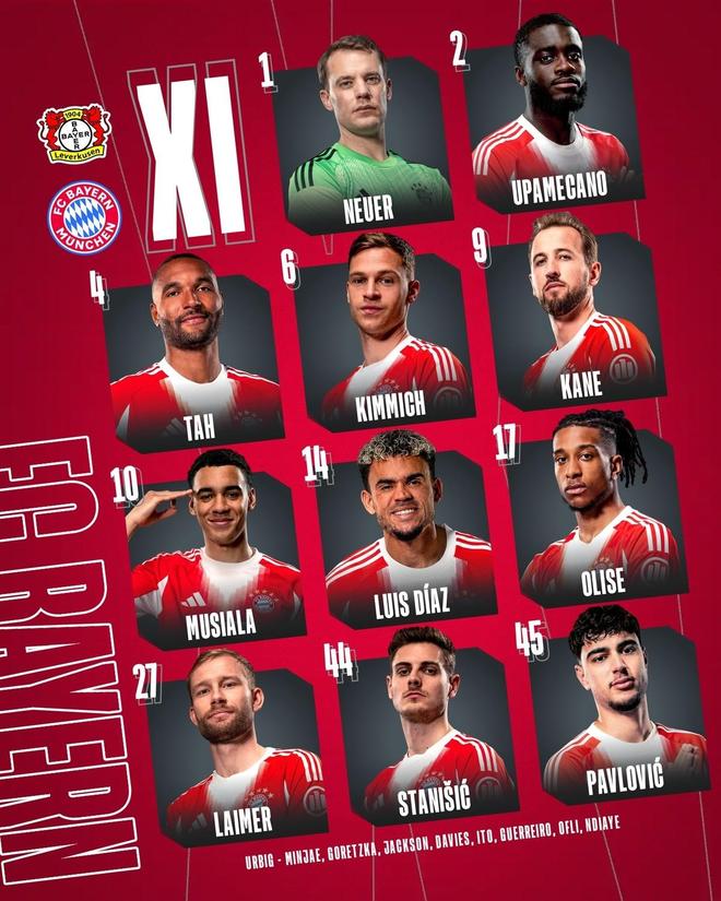 拜仁首发:1-诺伊尔、44-斯塔尼希奇、2-于帕梅卡诺、4-约纳坦-塔、27-莱默尔、6-基米希、45-帕夫洛维奇、10-穆西亚拉、14-路易斯-迪亚斯、17-奥利塞、9-凯恩